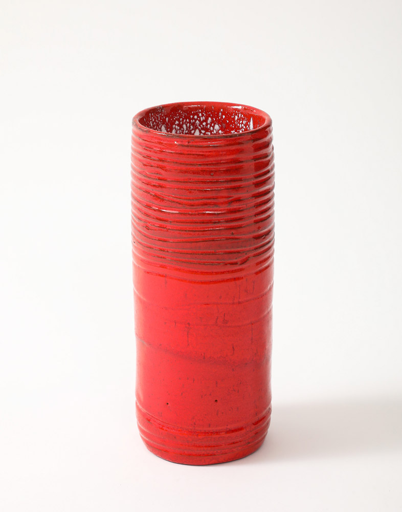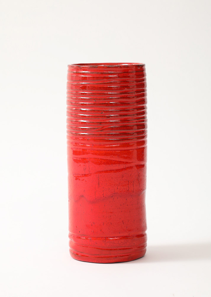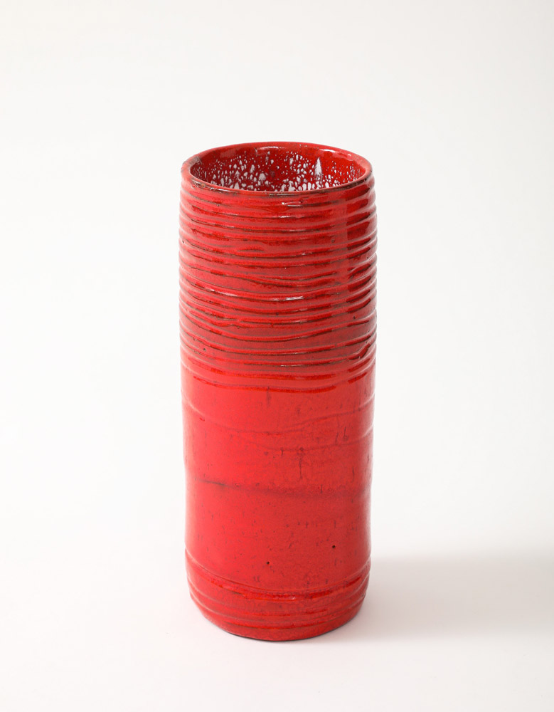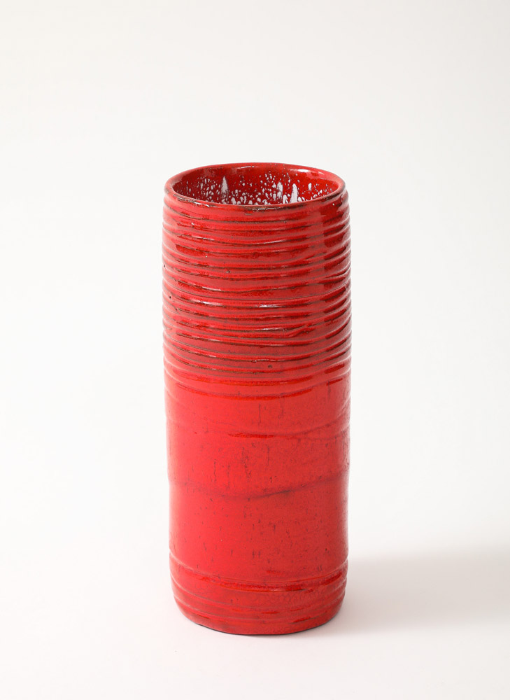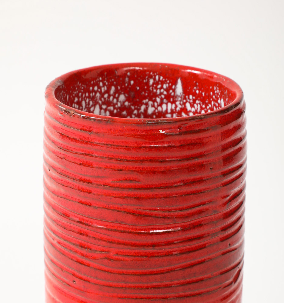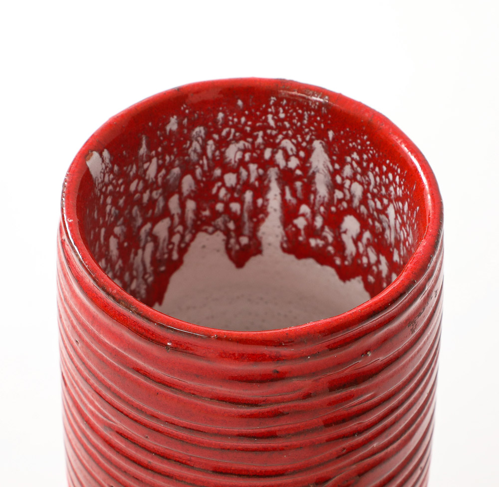 Blood Red Enamel Glaze Ceramic Rousseau Vase with Striated Decoration, France. c. 1950, signed: ‘BL’