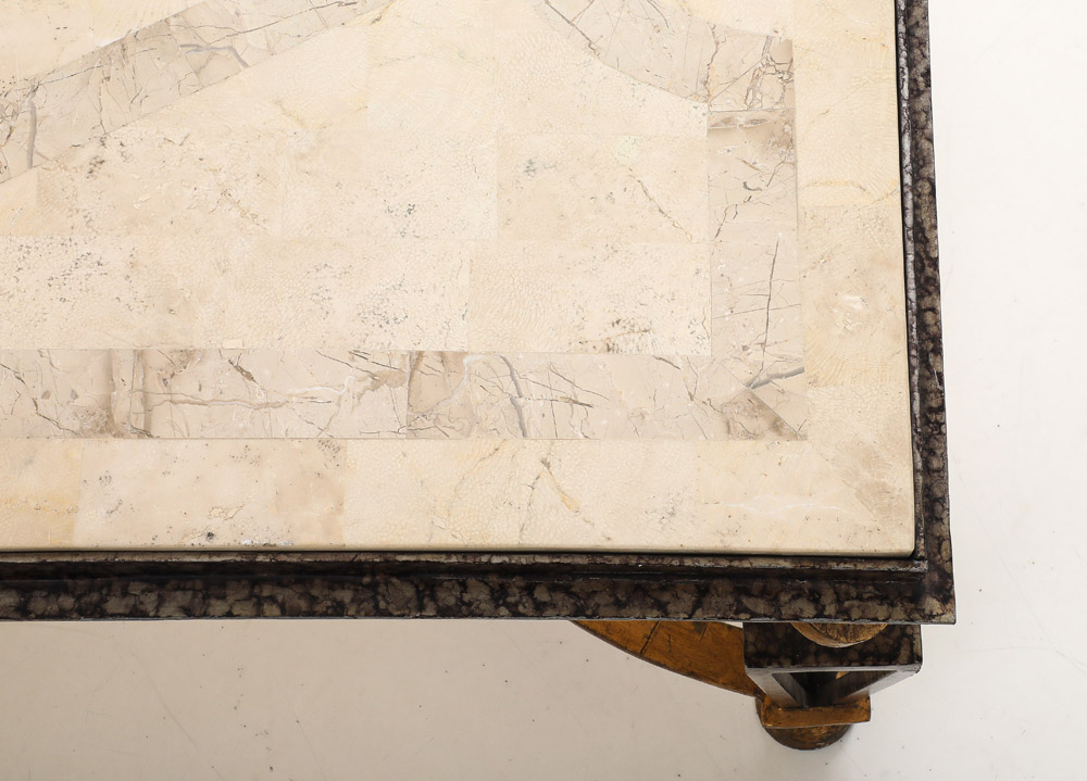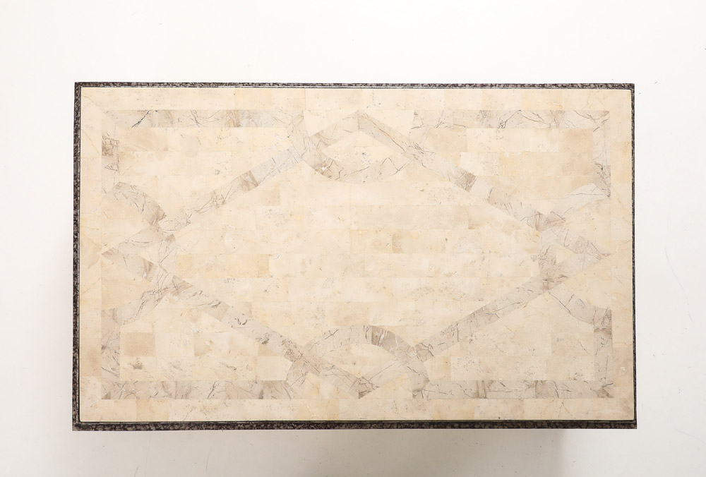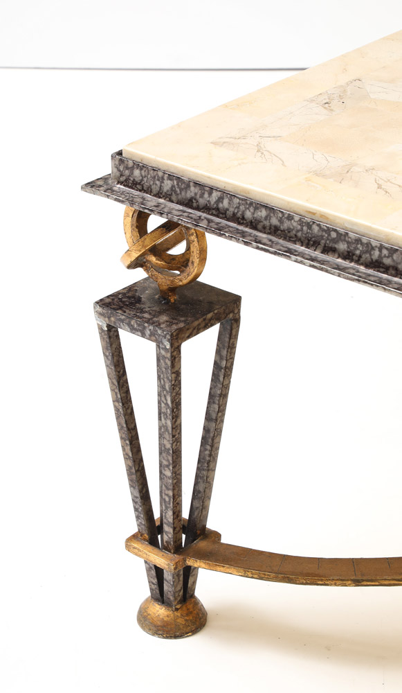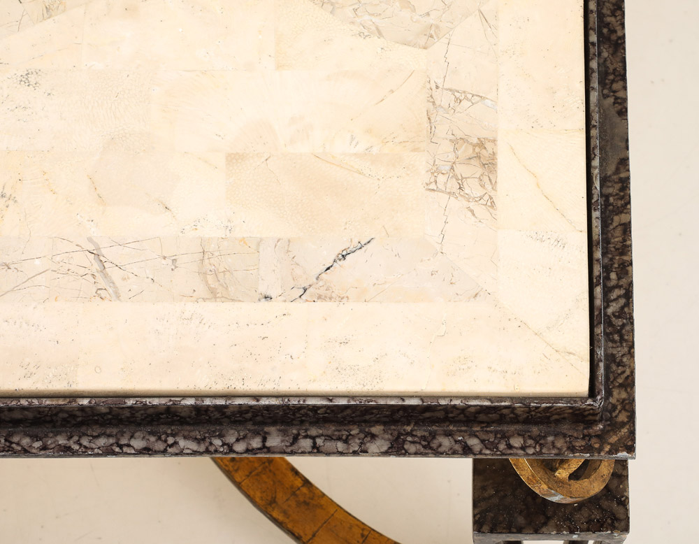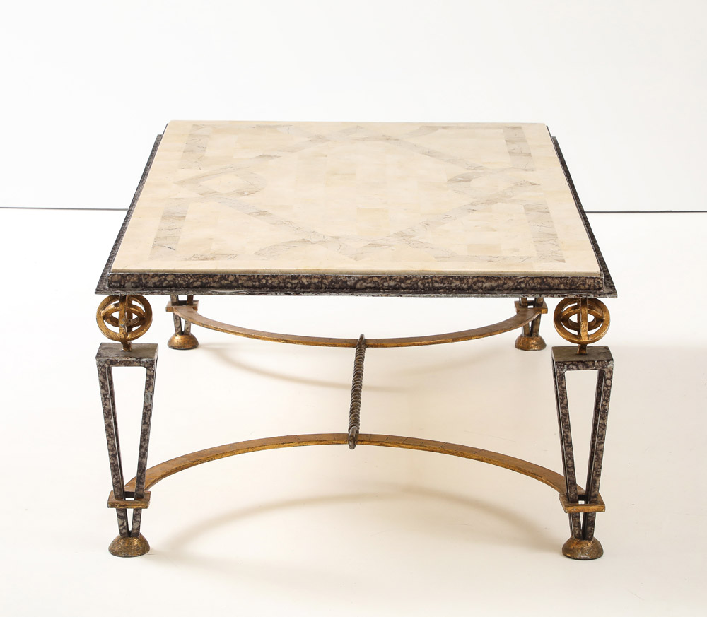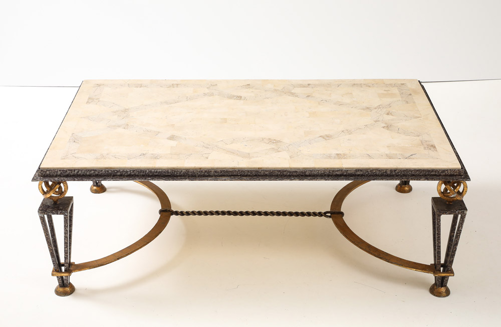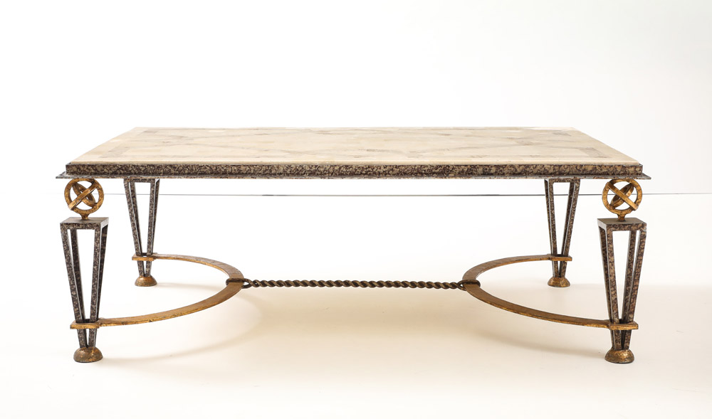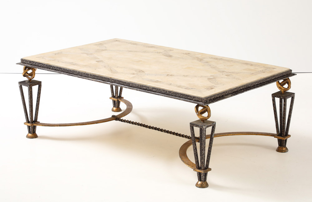 Inlaid Travertine Coffee Table in the style of Gilbert Poillerat, France, 1980