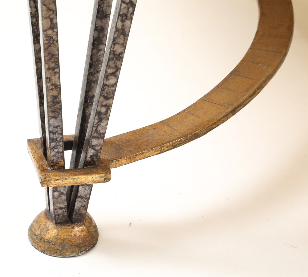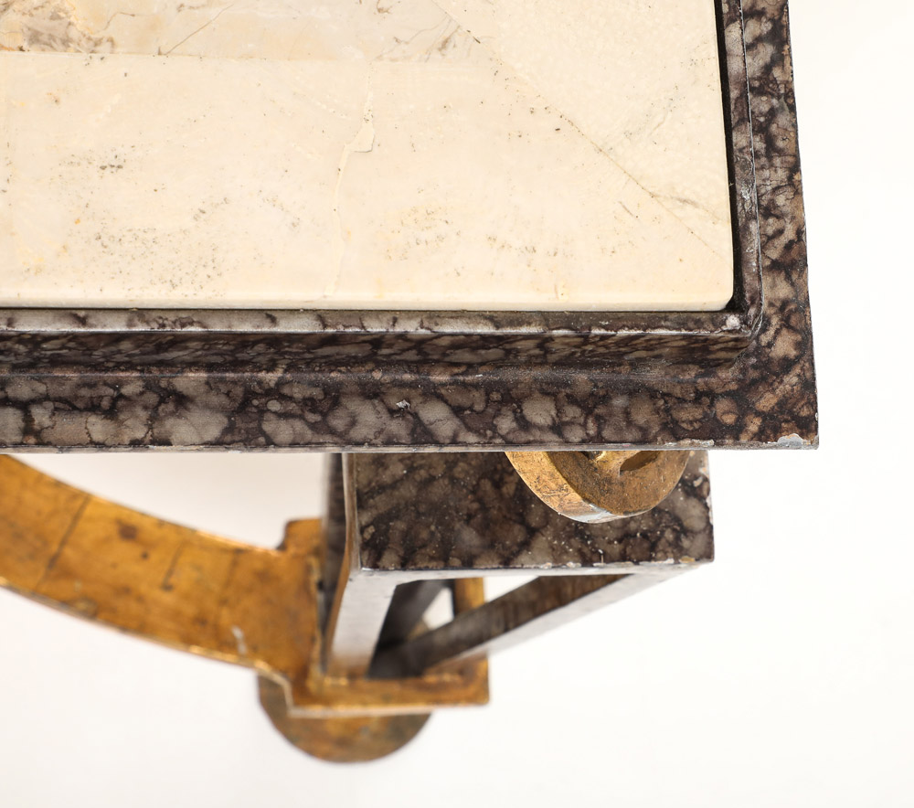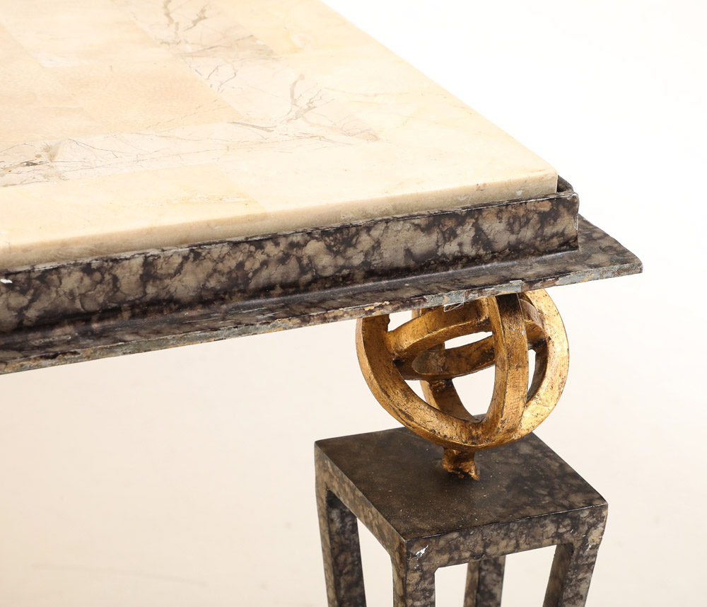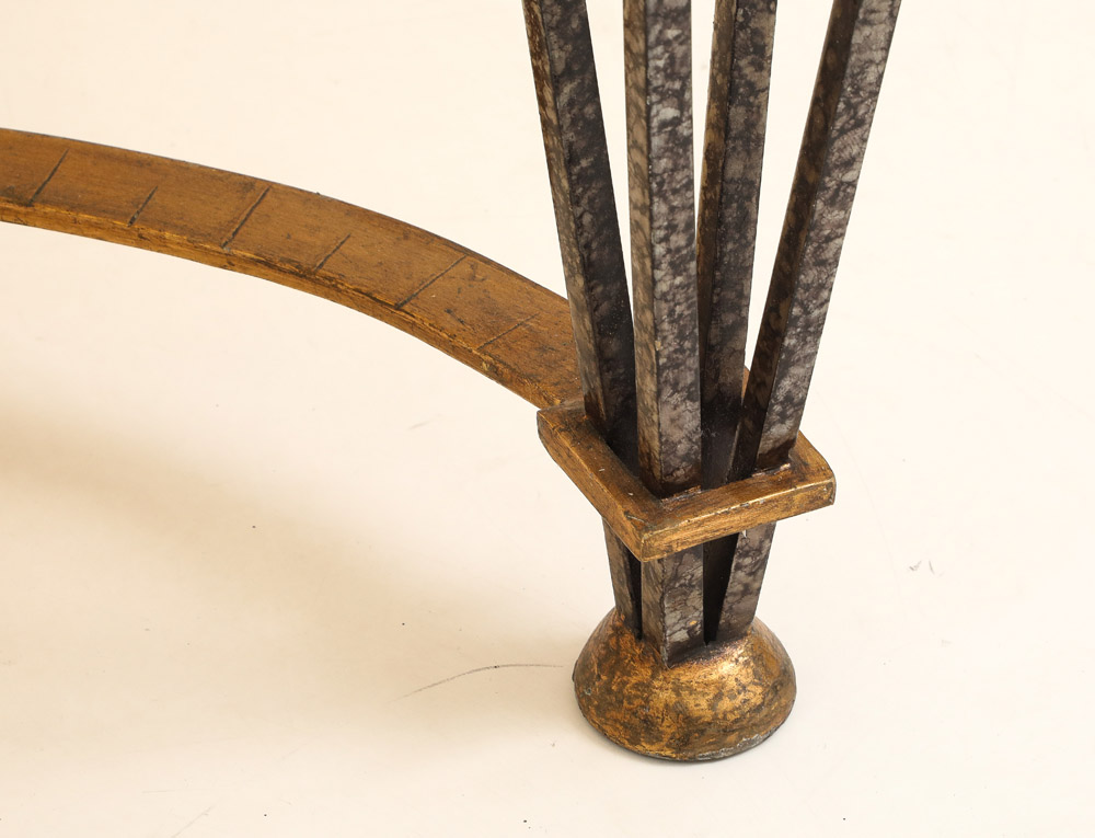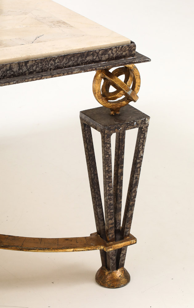 Patinated & Gilded Iron, Travertine, Open Inverted Obelisk legs with Spheres, Demi-lune & Twisted Iron Stretcher