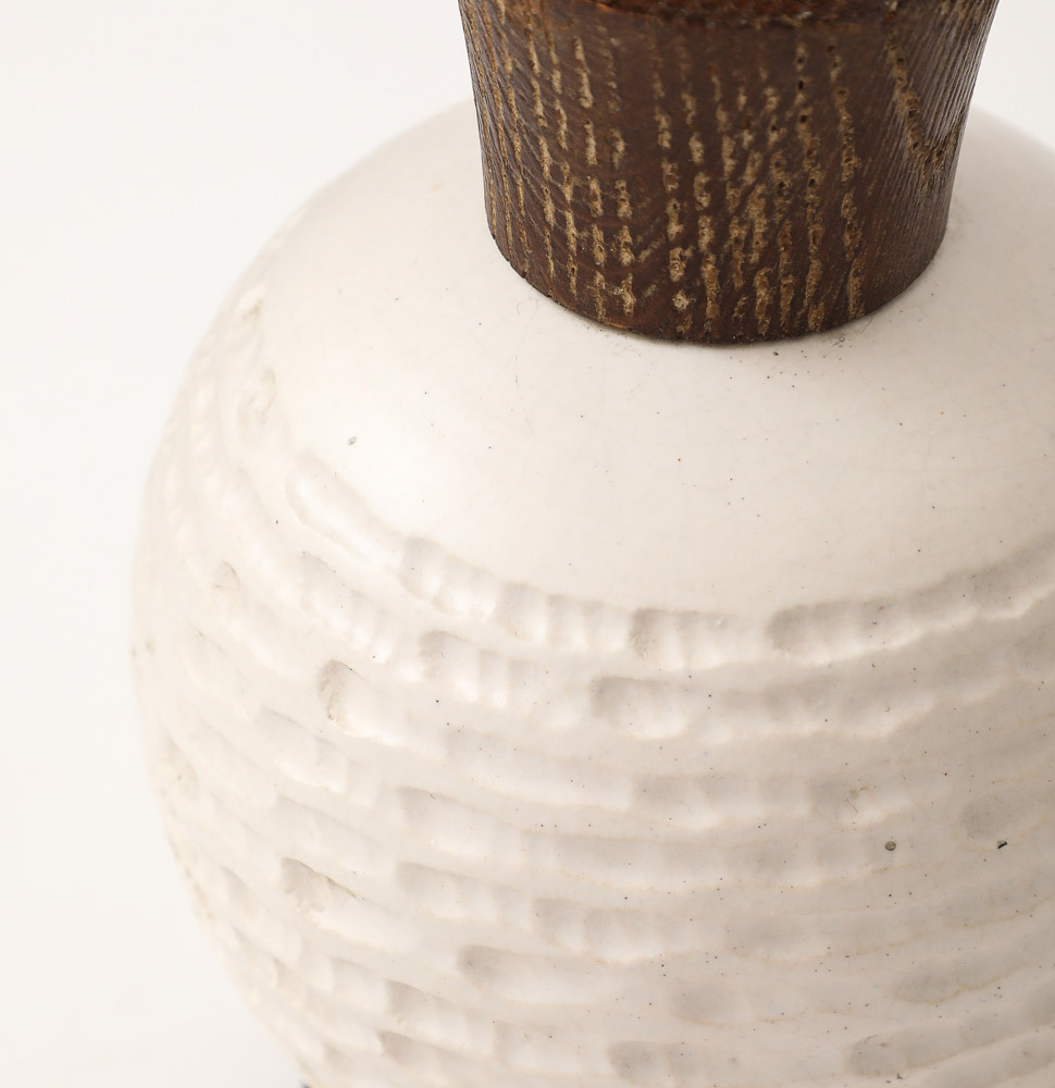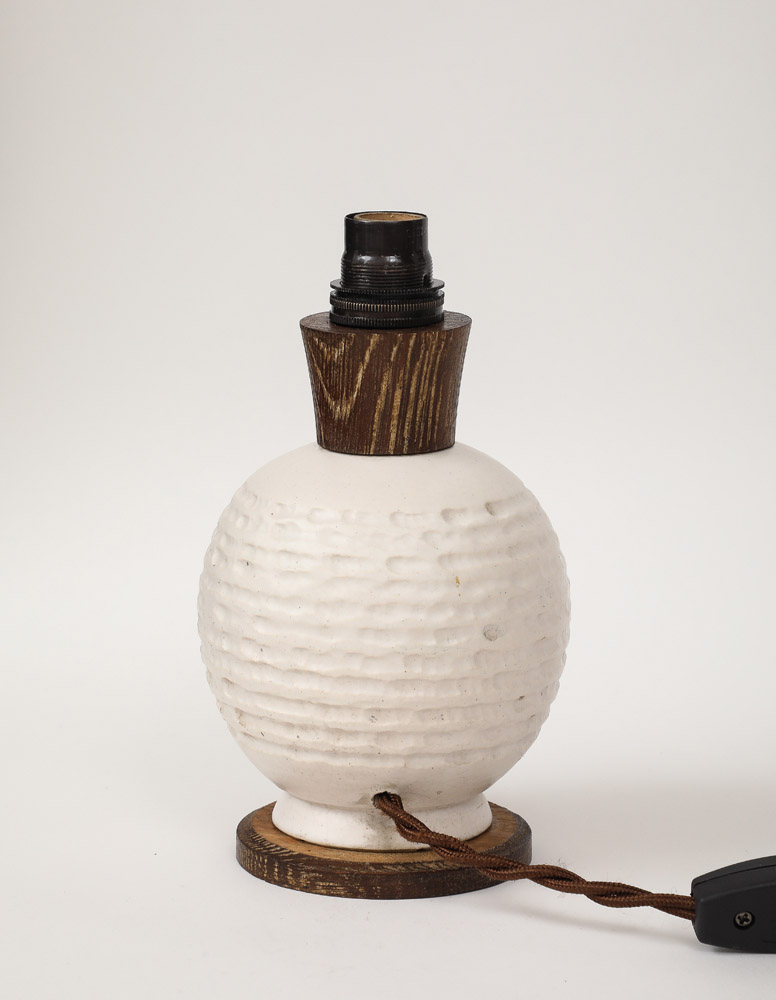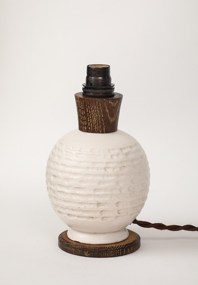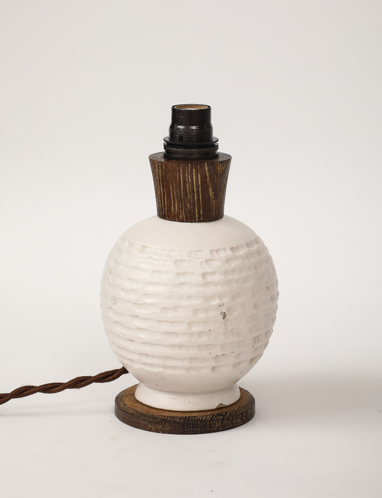 White Ceramic Lamp with Limed Oak & Bronze Hardware, France, c. 1940